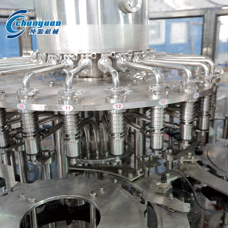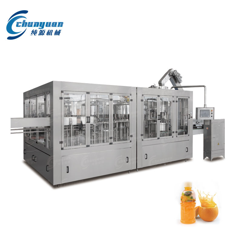 純?cè)礄C(jī)械廠家供應(yīng)的果蔬汁飲料機(jī)械集洗瓶、灌裝、封蓋于一體,適用于各種果汁、茶飲料的灌裝。