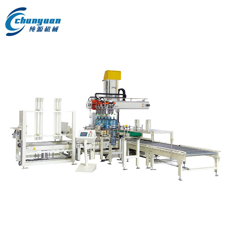 大桶碼垛機是將已灌裝好的5加侖桶按一定排列碼放在托盤(木質(zhì)、塑膠)上,進行自動堆碼,可堆碼多層,然后自動輸至實托工位,便于叉車運至倉庫儲存。本設(shè)備采用PLC+觸摸屏控制,實現(xiàn)智能化操作管理,實現(xiàn)人機對話,可顯示生產(chǎn)速度,故障原因及位置,自動化程度高。簡便、易掌握,可大大地減少勞動力和降低勞動強度。