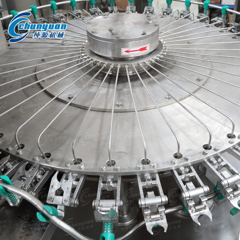 PET瓶由分瓶星輪進(jìn)入設(shè)備由夾鉗和翻轉(zhuǎn)機(jī)構(gòu)夾住瓶口轉(zhuǎn)至瓶口朝下,無菌水沖洗后瀝干,自動(dòng)翻轉(zhuǎn)至瓶口朝上,經(jīng)出瓶星輪輸送至灌裝機(jī)。設(shè)備主要結(jié)構(gòu)與沖洗介質(zhì)接觸部分和外部防護(hù)罩均為優(yōu)質(zhì)不銹鋼材料;開放式齒輪傳動(dòng)。